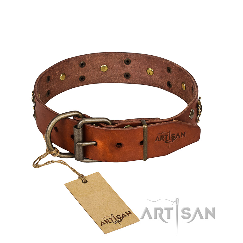 What about the embellishments, they are charming! Catchy studs are set along the leather strap. These decorations are brass plated and, therefore shine with attractive glittering. The posh design of this tool is inimitable and unique. Due to these decorative elements, this full grain leather dog collar has a spark. That means your dog will have his