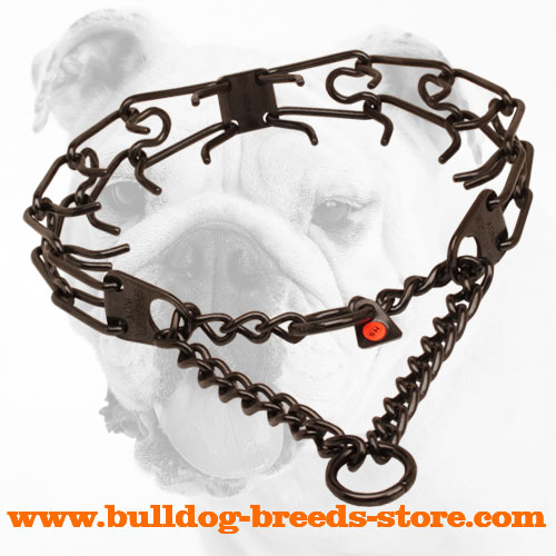The durable prongs are evenly arranged around the length of the collar, so when your canine starts to pull, the tension affects him all around his/her neck. The pressure is evenly distributed making your dog feel pinches, thus, distracting the animal from the object he/she is trying to pull you to. This kind of influence is similar to that which dogs experience in their puppy age, when their mother-dog bites their necks making the pups calm down. So there is nothing cruel or violent about using such way of behavior correction.